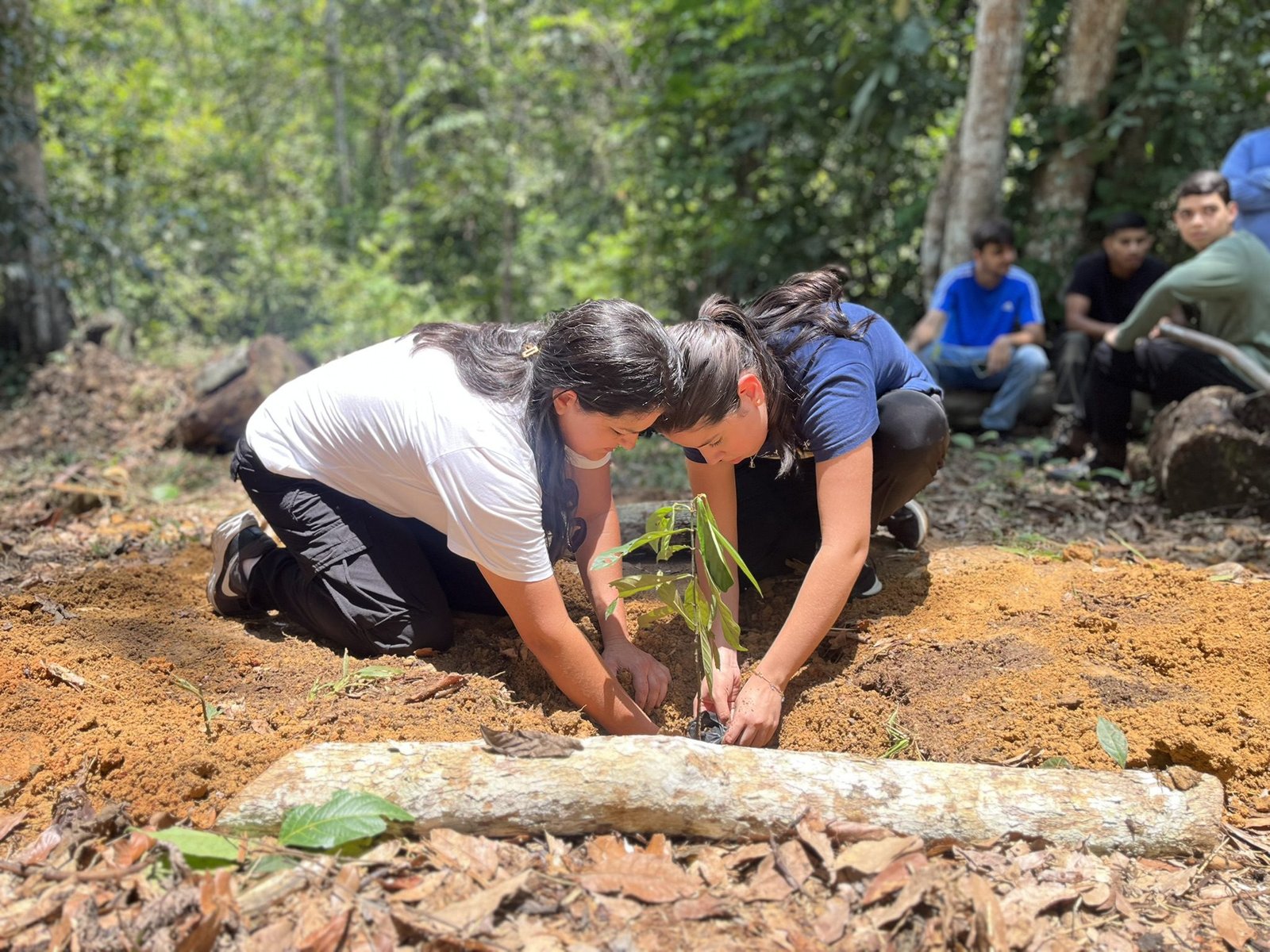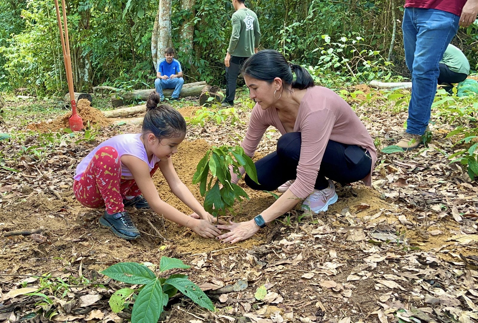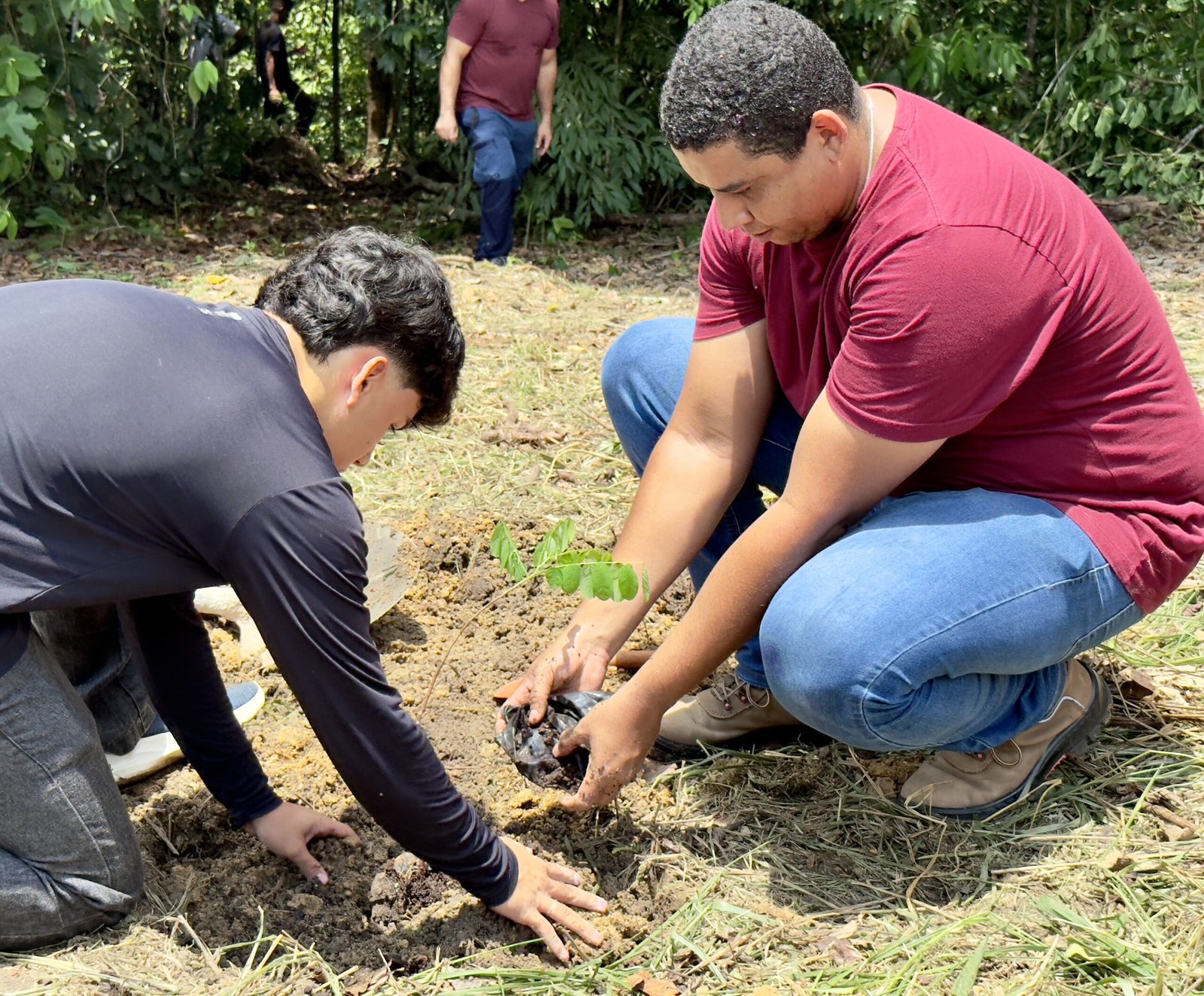das árvores na área do núcleo e apresentação dos jovens sobre cada uma das espécies, incluindo o João Brandinho, abordando as características, propriedades medicinais e o plantio de algumas delas. Em seguida, foi realizado o plantio e adubação de mudas de chacronas, envolvendo também a participação de algumas crianças.